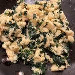 So I re-read the directions. Thought, Hey, I bet I’m taking them off the fire too soon! So this morning I heated up a teaspoon of olive oil, threw in some leftover cooked chopped spinach to heat up, then gave my pouch a big squeeze. Let it sit (as instructed) to cook a bit before doing anything. Then I started breaking it up, salted it a bit, and kept breaking it up and cooking for another two whole minutes. Okay, that’s better – a saucer of scrambled “eggs” with spinach, complete with (nearly) real-egg mouthfeel. But honestly, I still wasn’t super enthusiastic.